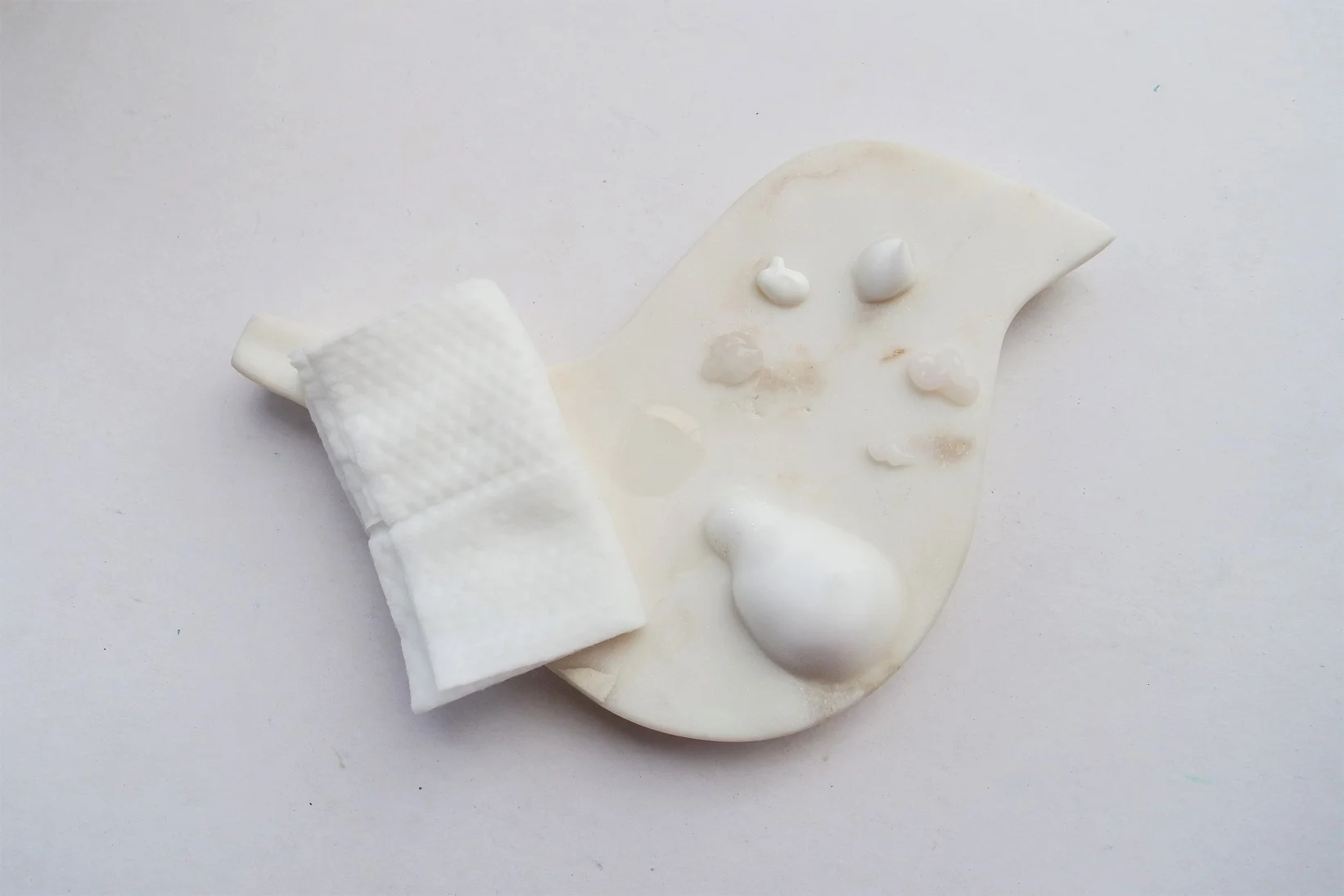 Swatches, clockwise from left: cleansing wipes, clarifying toner, reviving serum, day lotion, night cream, recharging mask, and foaming cleanser