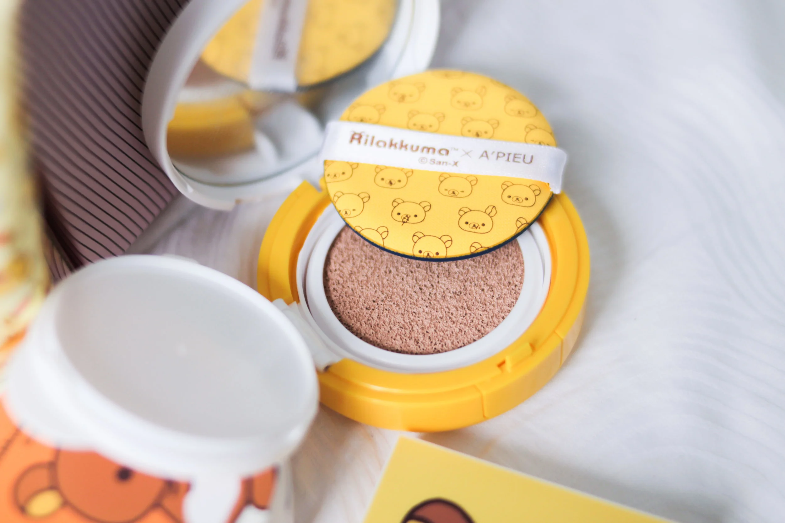 The A'Pieu Air Fit Cushion XP Set Rilakumma Edition (P720) comes in a cute yellow and white compact with a custom printed applicator. The coverage is light to medium, with a lovely glowy finish that evens out the skin in just a few neat pats. It's very easy to blend and adheres on skin smoothly! It comes in two standard shades, No.21 and No.23.