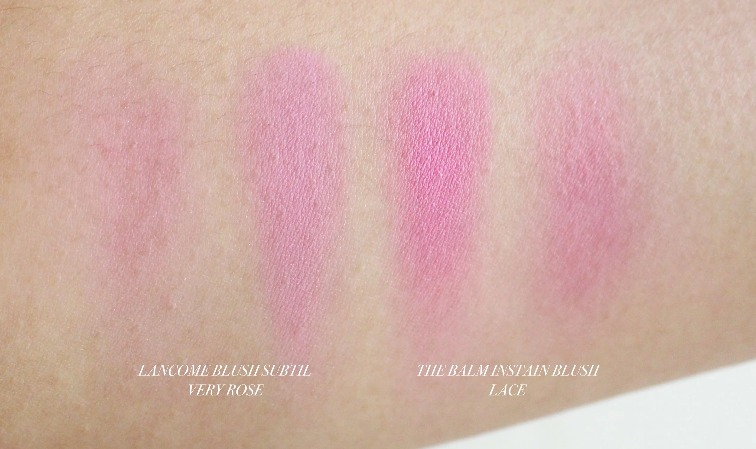 The Lancome in Very Rose has a slight mauve tint to it whereas the Instain in Lace is a brighter pink. The difference is almost undetectable though, even the matte finish. They look quite bright in the pan but they diffuse into a pretty sheer pink that works with whatever skin tone you might have. The formula are both topnotch - except Lancome comes in a luxurious compact with a brush compared to TheBalm's cardboard box.
