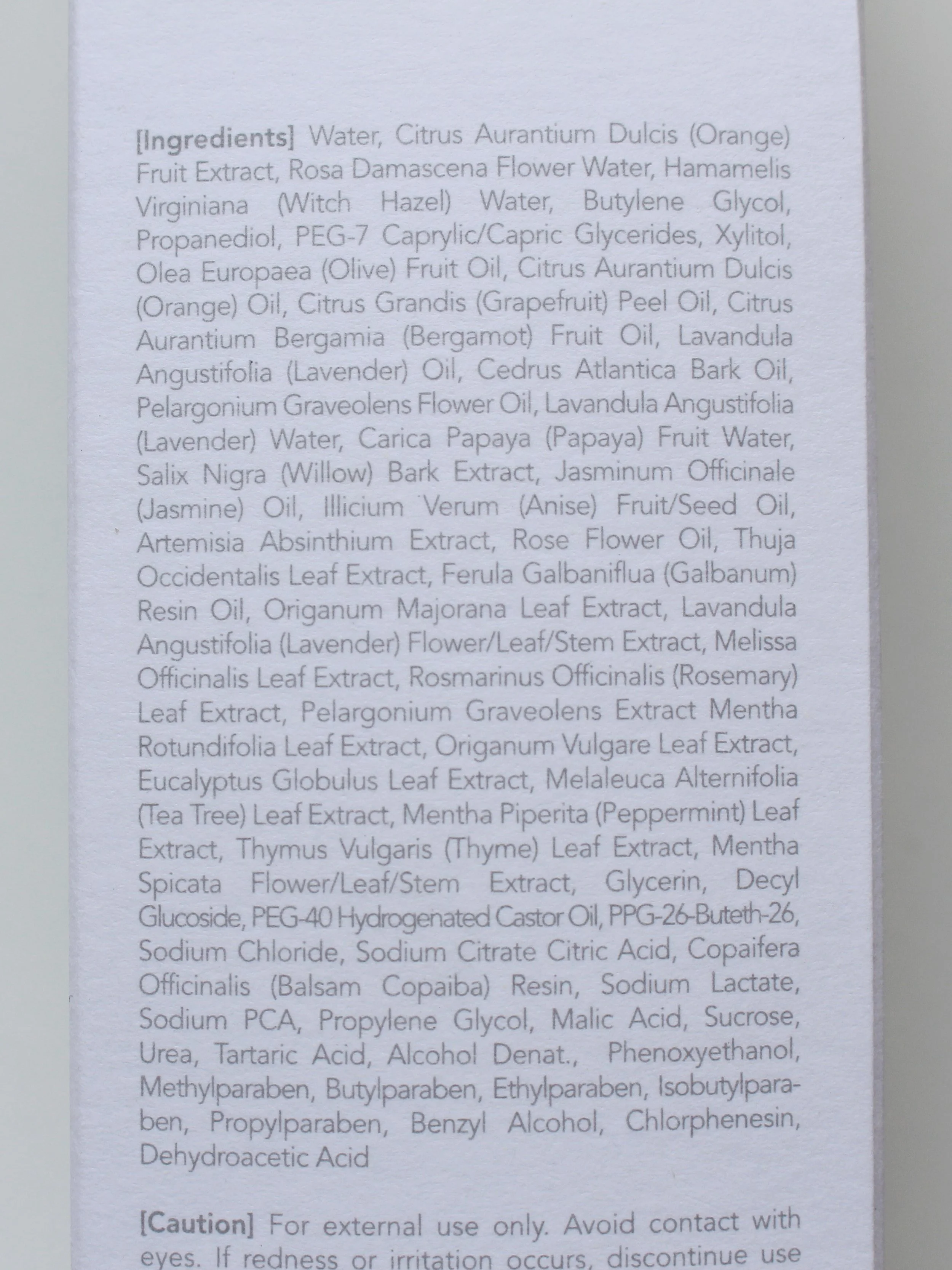 US FDA-compliant ingredient list: Water, Rose Damascena Flower Water, Orange Peel Extract, Hamamelis Virginiana Water, Butylene Glycol, Propanediol, PEG-7 Caprylic/Capric Glycerides, Alcohol Denat., Xylitol, Phenoxyethanol, Decyl Glucoside, PEG-40 Hydrogenated Castor Oil, PPG-26-Buteth-26, Sodium Chloride, Sodium Citrate, Citric Acid, Citrus Aurantium Bergamia (Bergamot) Fruit Oil, Olea Europaea (Olive) Fruit Oil, Citrus Aurantium Dulcis (Orange) Peel, Grapefruit Peel oil, Lavandula Angustifolia (Lavender) Oil, Cedrus Atlantica Bark Oil, Pelargonium Graveolens Flower Oil, Lavandula Angustifolia (Lavender) Water, Carica Papaya (Papaya) Fruit Water, Copaifera Officinalis (Balsam Copaiba) Resin, Jasminum Officinale (Jasmine), Illicium Verum (Anise) Fruit/Seed Oil, Sodium Lactate, Sodium PCA, Artemisia Absinthium Extract, Rose Flower Oil, Propylene Glycol, Thuja Occidentalis Leaf Extract, Ferula Galbaniflua (Galbanum) Resin Oil, Malic Acid, Sucrose, Urea, Tartaric Acid, Origanum Majorana Leaf Extract, Lavandula Angustifolia (Lavender) Flower/Leaf/Stem Extract, Melissa Officinalis Leaf Extract, Rosmarinus Officinalis (Rosemary) Leaf Extract, Salix Nigra (Willow) Bark Extract, Pelargonium Graveolens Extract, Mentha Rotundifolia Leaf Extract, Origanum Vulgare Leaf Extract, Eucalyptus Globulus Leaf Extract, Melaleuca Alternifolia (Tea Tree) Leaf Extract, Mentha Piperita (Peppermint) Leaf Extract, Thymus Vulgaris (Thyme) Leaf Extract, Mentha Spicata Flower/Leaf/Stem Extract, Benzyl Alcohol, Chlorphenesin, Methylparaben, Dehydroacetic Acid, Butylparaben, Ethylparaben, Isobutylparaben, Propylparaben. (from Soko Glam)