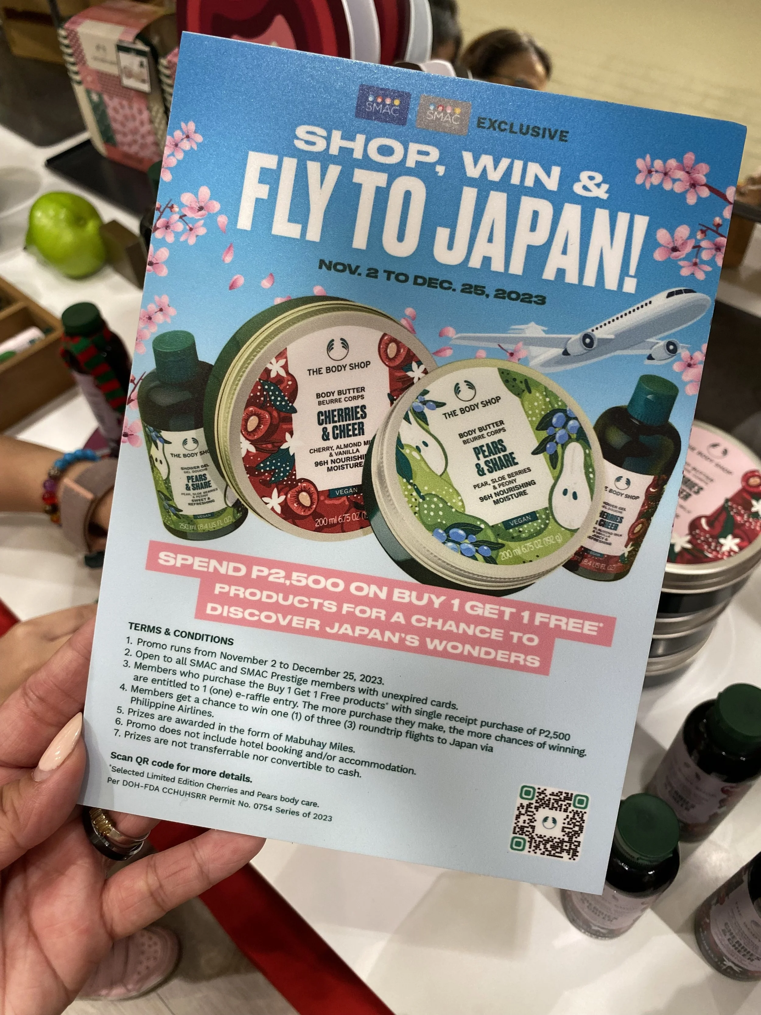 The Body Shop and SM Malls are also having an exclusive promo for SMAC card holders, where you can win a roundtrip flight to Japan with Philippine Airlines. Just make a single-receipt purchase worth P2,500 from their Buy 1 Get 1 products in the seasonal scents Pears & Share or Cherries & Cheer. A buy one get one deal with a vacation on top, Christmas couldn’t get any better than that!