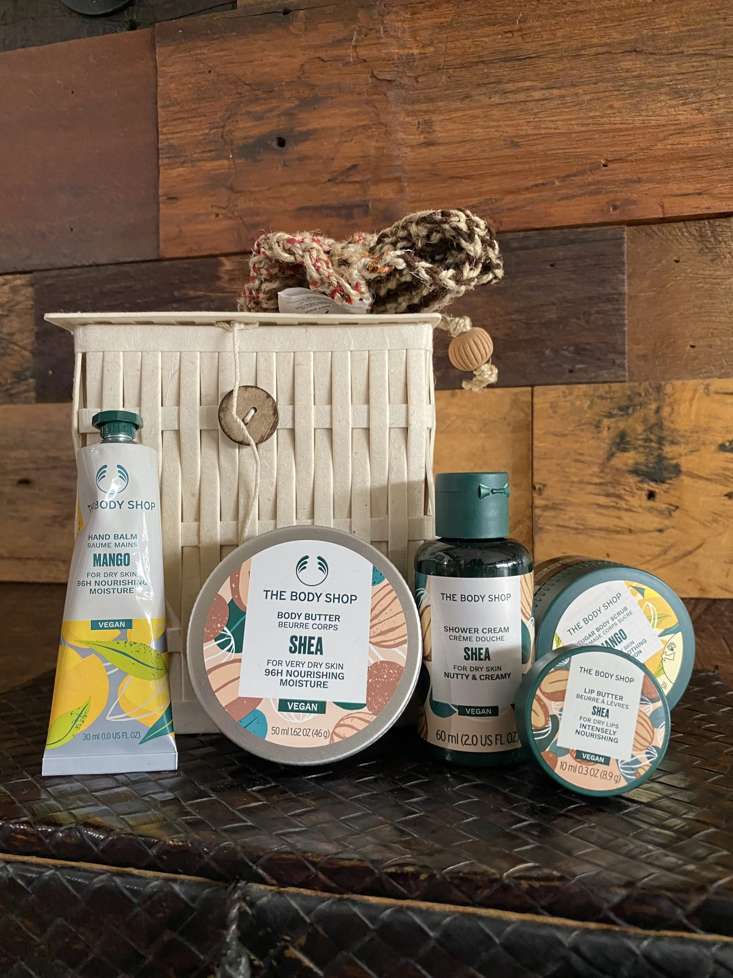 Contained within each basket is a thoughtfully curated selection of products: a 50ml Shea Body Butter, a 50ml Mango Body Scrub, a 60ml Shea Shower Cream, a 30ml Mango Hand Balm, a 10ml Shea Lip Butter, and a Jute Star Scrubber. These items offer a blend of nourishment and indulgence, catering to various skincare needs.