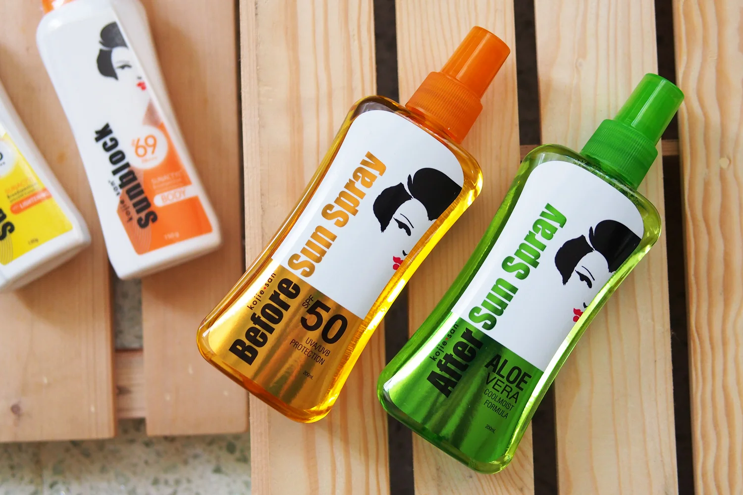 Kojie-san Before Sun Spray SPF50, Kojie-san After Sun Spray Aloe Vera, Kojie-san Sunscreen SPF55 with Lightening (P455 each), and Kojie-san Sunblock SPF69 Sunactyl Broadspectrum for Body (P360)