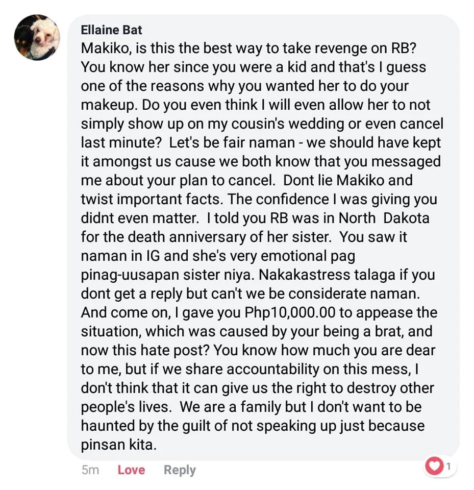 As for Makiko’s post, it was taken down from Facebook after her cousin Ellaine (who was mentioned by RB) called her out in the comments section of her post. Guess that’s the end of that story!